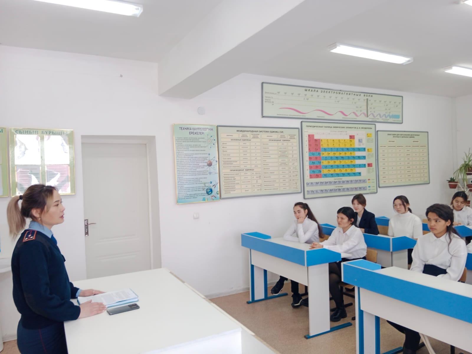 "Ыбырай Алтынсарин атындағы орта мектебі" КММ-де 2023 жылдың 13-ақпан күні құқықтық тәрбие беру айлығы аясында кәмелетке толмағандар арасында жыныстық тиіспеушіліктің және құқық бұзушылықтың алдын алу мақсатында Шу АПБ ЖПҚБ-нің әйелдерді зорлық-зомбылықтан қорғау тобының аға инспекторы полиция аға лейтенанты Садық Жансая Қырбашқызы мектептің 10-11 сыныптардың қыз балаларына "Жыныстық тиіспеушілік және ерте жүктілік" тақырыбында дәріс жүргізді. Дәріс барысында қыз балаларға ерте жүктіліктің қауіптілігі туралы айтып, жыныстық тиіспеушілік пен ерте жүктіліктің алдын алу бойынша ақыл-кеңестер берді.