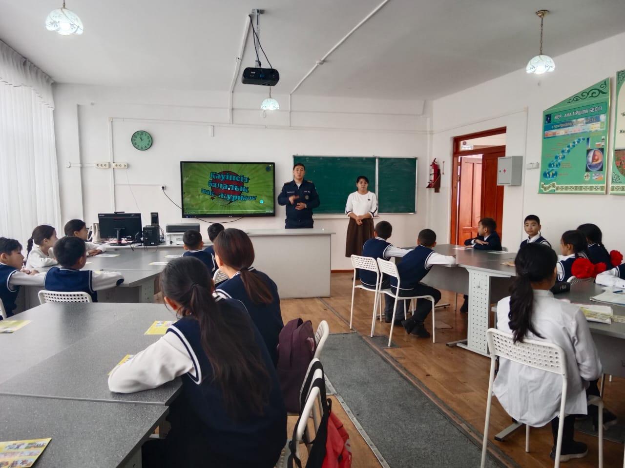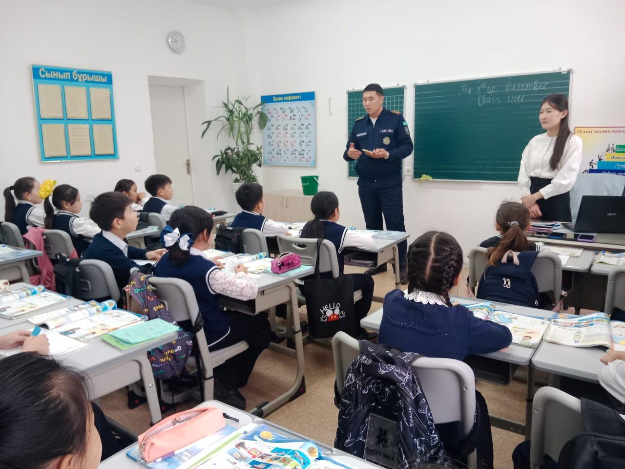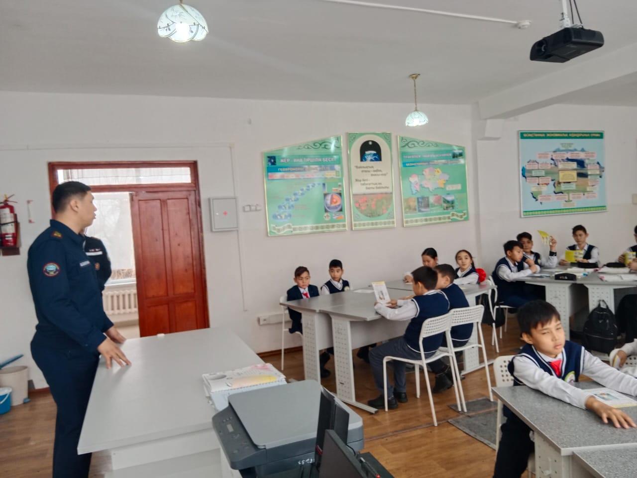 Шу қаласы «Ыбырай Алтынсарин атындағы орта мектебі» КММ-нде 2023 жылдың 7-желтоқсан күні Шу ауданы төтенше жағдайлар бөлімінің қызметкерлері М.Б. Пернебаев пен М.Т.Джумурбаев жасөспірімдердің қауіпсіздігін қамтамасыз ету мақсатында білім алушыларға өрт қауіпсіздігі, терезеден құлап кету қауіпсіздігі бойынша үгіт насихат жұмыстарын жүргізіп бейнероликтер көрсетіп, жадынамалар таратып берді.