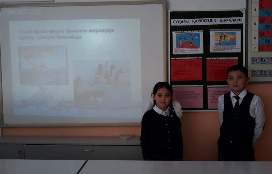 2018 - 2019 оқу жылында мектеп оқушыларына белгісіз су айдындарында ересектердің қадағалауынсыз шомылмауы жөнінде,ата-аналары немесе қамқоршыларының қарауы бойынша су айдындарына шомылған жағдайда судағы қауіпсіздікті сақтау бойынша түсіндіру жұмыстары жүргізілді. Даярлық сыныптарында "Су айдынындағы қауіпсіздік ережелері" тақырыбында түсіндірме жұмыстары жүргізілді, бастауыш сынып1-4 сынып оқушыларынан «Суда жүзу білеміз бе?» тақырыбында сауалнама алынып, суда жүзу кезіндегі қауіпсіздік шаралары түсіндірілді. Су айдынындағы қауіпсіздік туралы сынып сағаттарын өтті. 5-9 сынып оқушыларына «Су айдындарындағы қауіпсіздік» тақырыбында сынып сағаттары өткізіліп,су қауіпсіздігі,судағы қауіптің алдын-алу бойынша атқарылатын іс-шаралар жөнінде бейнероликтер көрсетілді. 10 - 11 сынып аралығындағы оқушыларға "Судағы қатер" тақырыбында түсіндірме жұмыстары жүргізілді.