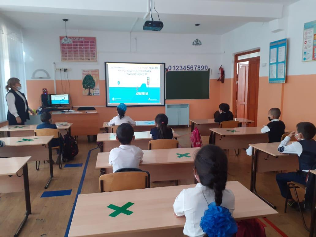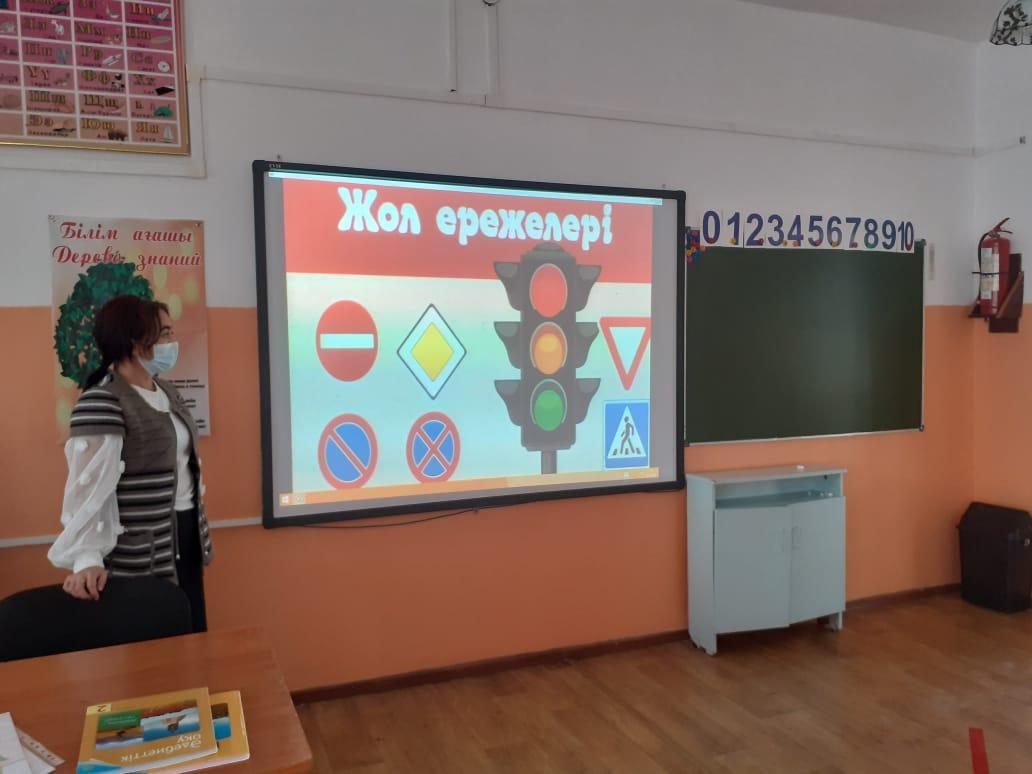 «Қауіпсіз мектеп автобусы» республикалық акциясы аясында «Жолда жүру ережесін сақтайық!» тақырыбында мектеп тәлімгері А.О. Акшабаева жол ережесін сақтау бойынша нұсқау бейнебаяндарын көрсетті. Балаларды жолда жүру ережесімен таныстырып, жол ережісін білудің маңызды екенін түсіндіріп өтті.Кезекші сыныптардың жалпы 118 оқушысы қамтылды.