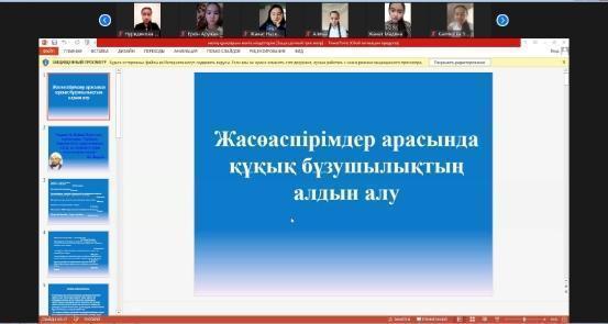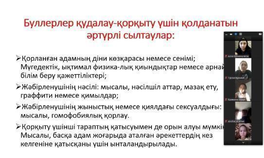 Шу қаласы «Ыбырай Алтынсарин атындағы орта мектебі»КММ –де 2020 жылдың 14 қазан күні қыздар жиналысы ZOOM платформасы арқылы қашықтықтан ұйымдастырылып өткізілді. Күн тәртібінде «Қызға қырық үйден тыйым» тақырыбында мектептің педагог –ұйымдастырушысы Тұрғанбаева Баян Мұхтаровна қыз әдебі туралы, қызға тән мінез-құлық жайлы , салтымыздағы қыз тәрбиесіне байланысты тыйымдар жайлы айтып өтті. Ерте жүктіліктің алдын алу мақсатында мектептің педагог- психологы Таткеева Елмира Жүжасаровна «Ерте жүктілік және оның жауапкершілігі мен зиянды жақтары» тақырыбында түсіндірме бейнероликтер көрсетті, таныстырылым арқылы ақпарат берді.Денсаулықты сақтаудың маңызы туралы, әсіресе, қыз бала денсаулығын күтудің ерекшелігі туралы кеңес берді. Мектеп медбикесі Башегова Бейбіткул Дархановна қыздар гигиенасы туралы баяндама оқыса, директордың құқық ісі жөніндегі орынбасары Нурбекова Мөлдір Мияткуловна «Менің құқықтарым , менің міндеттерім » тақырыбында адамның құқықтарынан басқа міндеттерінің болатыны және ол заңмен заңдастырылғаны жайлы, Қазақстан Ренспубликасының қылмыстық кодексінің 274 бабы «көрінеу, жалған ақпарат тарату» туралы баппен таныстырды «WhatsApp» , Facebook,instagram әлеуметтік желілері арқылы жалған ақпарат тарату заңмен жазаланатыны туралы түсіндірме жұмысын жүргізді. Директордың тәрбие ісі жөніндегі орынбасары Адалбекова Асем Рустемовна «Өзіңді қорғай біл » кибербуллинг, антибуллингтің қазіргі таңдағы қашықтық оқыту кезеңінде белең алып турған мәселе екені, одан қорғанудың жолдары жайлы нұсқаулық беріп, түсіндірме жұмысын жүргізді. Жиналыс соңында оқушылар түрлі сұрақтар қойып, тиісті жауаптарын алды.