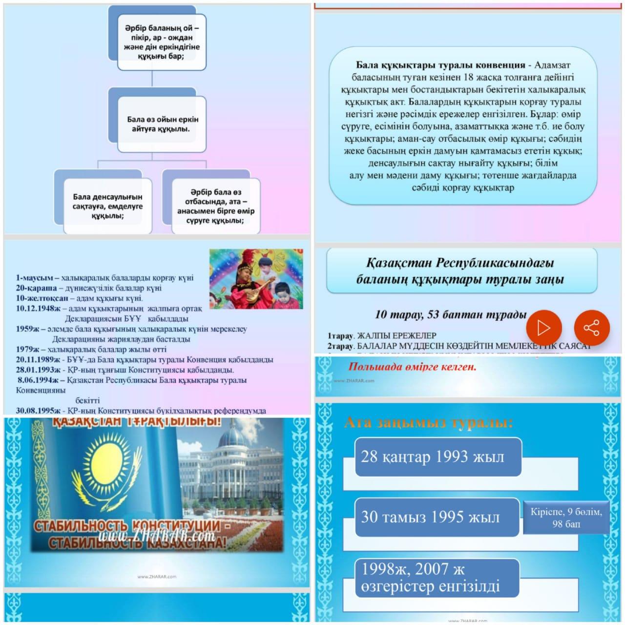 Шу қаласы «Ыбырай Алтынсарин атындағы орта мектебі» КММ-де «Болашаққа бағдар:Рухани жаңғыру» бағдарламасы аясында «Құқықтық мәдениет » жобасы бойынша «Құқықтық мәдениет-бала қауіпсіздігінің кепілі» тақырыбында 8-11 сынып оқушыларына директордың құқықтық тәрбие іс жөніндегі орынбасары М.М.Нурбекова WhatsApp әлеуметтік желісі арқылы танымдық сабағын жүргізді. Мақсаты: Кәмелетке толмағандардың құқықтарын қорғауын негізгі халықаралық және мемлекеттік заңдармен таныстыру.Білім алушыларға өз құқықтарын іс жүзінде қолдана білуге үйрету. Қазақстан Республикасының Ата заңы , Бала құқығы жайлы конвенция, Қылмыстық кодекс жайлы ақпарат беру. Азаматтық міндетті- заң талаптарын бұзбау, өзіне жүктелген міндеттерді атқару туралы ескертіліп, бейнебаяндар көрсетіліді,түсіндірме жұмыстары жүргізілді.