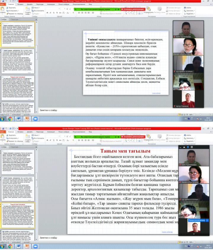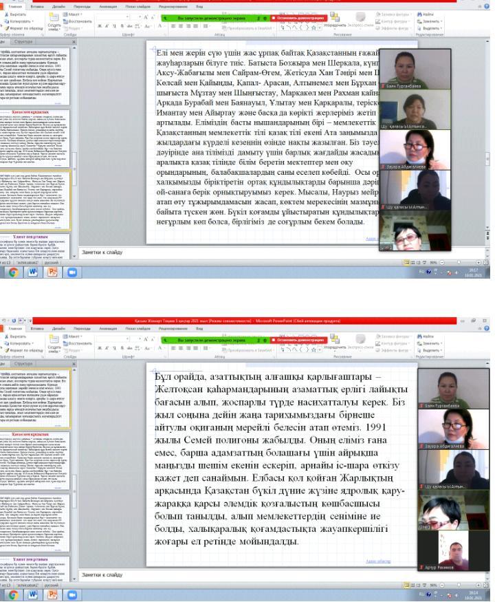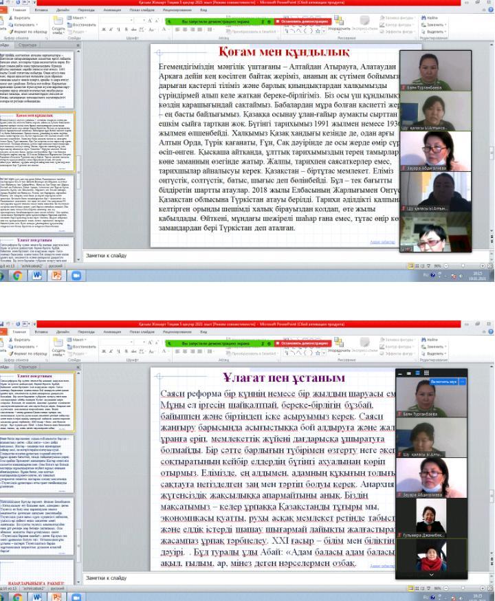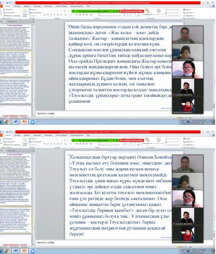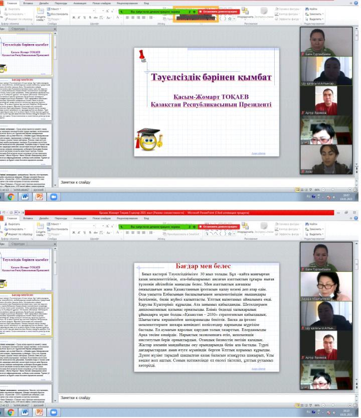 Шу қаласы «Ыбырай Алтынсарин атындағы орта мектебі» КММ-де 2021 жылдың 20 қаңтар күні Мемлекет басшысы Қасым-Жомарт Кемелұлы Тоқаев Қазақстан халқына 2021 жылдың 5 ші қаңтарындағы «Тәуелсіздік бәрінен қымбат» жарияланған мақала туралы ZOOM платформасы арқылы мектеп ұжымы өз ойлары мен бөлісті. Қасым-Жомарт Кемелұлы Тоқаев елімізде, ең алдымен, адамның құқығын толығымен сақтауға негізделген заң мен тәртіп болуы керек. Анархия мен жүгенсіздік жақсылыққа апармайтыны анық. Біздің мақсатымыз – келер ұрпаққа Қазақстанды тұғыры мықты, экономикасы қуатты, рухы асқақ мемлекет ретінде табыстау және елдік істерді шашау шығармай лайықты жалғастыратын жасампаз ұрпақ тәрбиелеу. ХХІ ғасыр – білім мен біліктің дәуірі. Бұл туралы ұлы Абай: «Адам баласы адам баласынан ақыл, ғылым, ар, мінез деген нәрселермен озбақ. Онан басқа нәрсеменен оздым ғой демектің бәрі де – ақымақтық» деген. «Жас келсе – іске» дейді халқымыз.Осы орайда Президент жанындағы Жастар кеңесінің қызметін жандандырған жөн. Оны білікті әрі білімді жастарды жұмылдыратын жүйелі жұмыс алаңына айналдырамыз. Бұдан бөлек, мен азаттық жылдарында дүниеге келген, әлі танылып үлгермеген талантты жастарды қолдау мақсатында «Тәуелсіздік ұрпақтары» атты грант тағайындауды ұсынамын. Халқымыздың біртуар перзенті Әлихан Бөкейханов «Ұлтқа қызмет ету білімнен емес, мінезден» деген.«Тәуелсіздік бәрінен қымбат!» деген бір ауыз сөз мәңгі ұранымыз болуға тиіс. Ұжым «Тәуелсіздік бәрінен қымбат» мақаланы назарға алып, тиісті бағытта жұмыс істеуді қолдады.