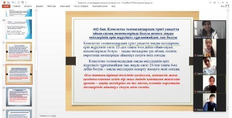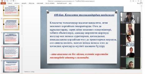 25 қаңтар күні директордың құқықтық тәрбие ісі жөніндегі орынбасары М.М.Нурбекова кәмелетке толмағандар арасында құқық бұзушылықтың алдын алу және жасөспірімдерді қоғамдық орындардағы тәртіп ережелерімен таныстыру мақсатында санитарлық-эпидемиологиялық талаптарды сақтай отырып 9,11 сынып оқушыларына және Zoom платформасы арқылы 8 сынып оқушыларына дәріс оқыды. Дәріс барысында ҚР Әкімшілік құқық бұзушылық Кодексінің 435,442,448,440 баптарымен және ҚР Қылмыстық Кодексінің 274-бап. Көрінеу жалған ақпарат тарату бабымен таныстырып, қоғамдық орындардағы тәртіп ережелері мен санитарлық-эпидемиологиялық ережелерін сақтау туралы айтылды.