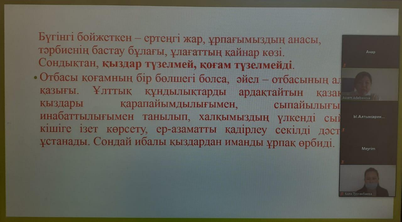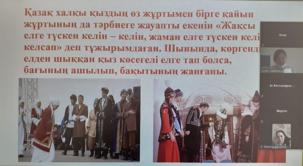 Шу қаласы «Ыбырай Алтынсарин атындағы орта мектебі » КММ –де «Қыз Жібек» қыздар клубының жоспарына сәйкес «Қыз бала ұлттың –ұяты, халықтың шырайы» атты айлық жүргізілуде.2021 жылдың 29 қаңтар күні мектеп директорының тәрбие ісі жөніндегі орынбасарыА.Р.Адалбекова "Қыз Жібек" клубының мүшелерімен 8-11 сынып қыздарымен "Бүгінгі бойжеткен, ертеңгі ....." тақырыбында баяндама оқып, ақпараттық түсіндірмелік іс-шарасын өткізді. Мақсаты: Қыздармен әңгімелесе отырып, ар-намысын, сұлулығын жоғары қоя біліп, жұрт алдында абыройлы болуға тәрбиелеу. Салауатты өмір салтын қалыптастырудағы ой өрісін дамыту зиянды әрекеттерге еліктеудің, қызығудың өмірлеріне қауіп тудыратынын ескерту. Іс-шара соңында "Қыз баланың сұлулығы иманында " , «Қыз әдебі», «Қыз қандай болу керек ? » сияқты бірнеше бейнероликтер көрсетілді.