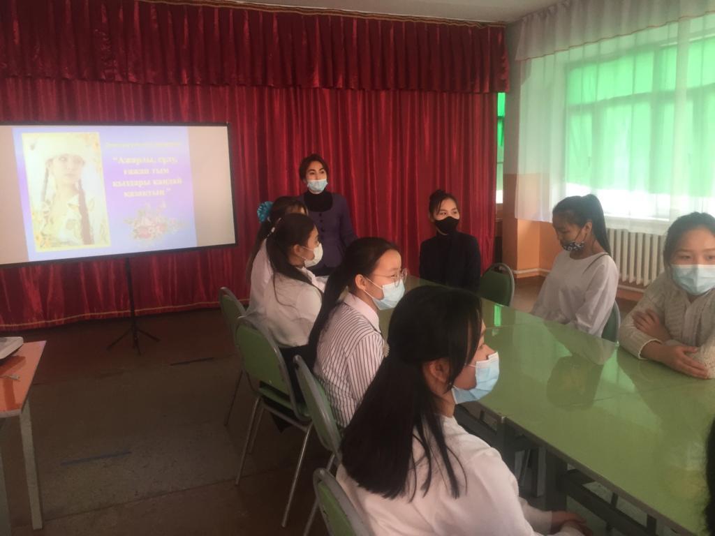 Ыбырай Алтынсарин атындағы орта мектебінде «Қыз бала – ұлттың ұяты, халықтың шырайы» атты айлығының іс – шара жоспарына сәйкес тәлімгер А.О. Акшабаева 9 - шы сыныптарының қыздарымен «Ажарлы, сұлу, ғажап тым қыздары қандай қазақтың» тақырыбында дөңгелек үстел өтті.