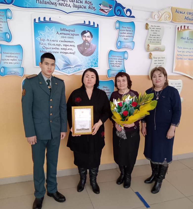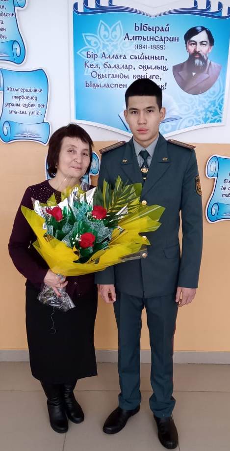 Шу қаласы «Ыбырай Алтынсарин атындағы орта мектебі» КММ-нің 2020-2021 оқу жылының түлегі Тұңғатаров Эльдар Жұмаханұлы мектеп ұжымын жаңа жылдық мерекесімен құттықтай келіп, 9-11 сынып білім алушыларымен кездесті. Кездесуге жалпы 39 білім алушы қатысты. Қазіргі таңда Тұңғатаров Эльдар Жұмаханұлы Щучинск қаласы Шоқан Уалиханов атындағы кадет корпусында әскери сержанттық борышын өтеп жатыр, өз мамандығының ерекшелігін білім алушыларға түсіндіріп, осы мамандықты таңдауға шақырды. Эльдардың оқу орнында үздік тәртібі мен білімімен көзге түскендіктен мектебіміздің директоры Сейдахметова Гүлбағила Бектібаевнаға оқу орнынан алғыс хат берілді. Осындай мұғалімдерінің саналы тәрбиесі мен сапалы білімін ақтайтын түлектеріміз көп болғай деп тілейміз.