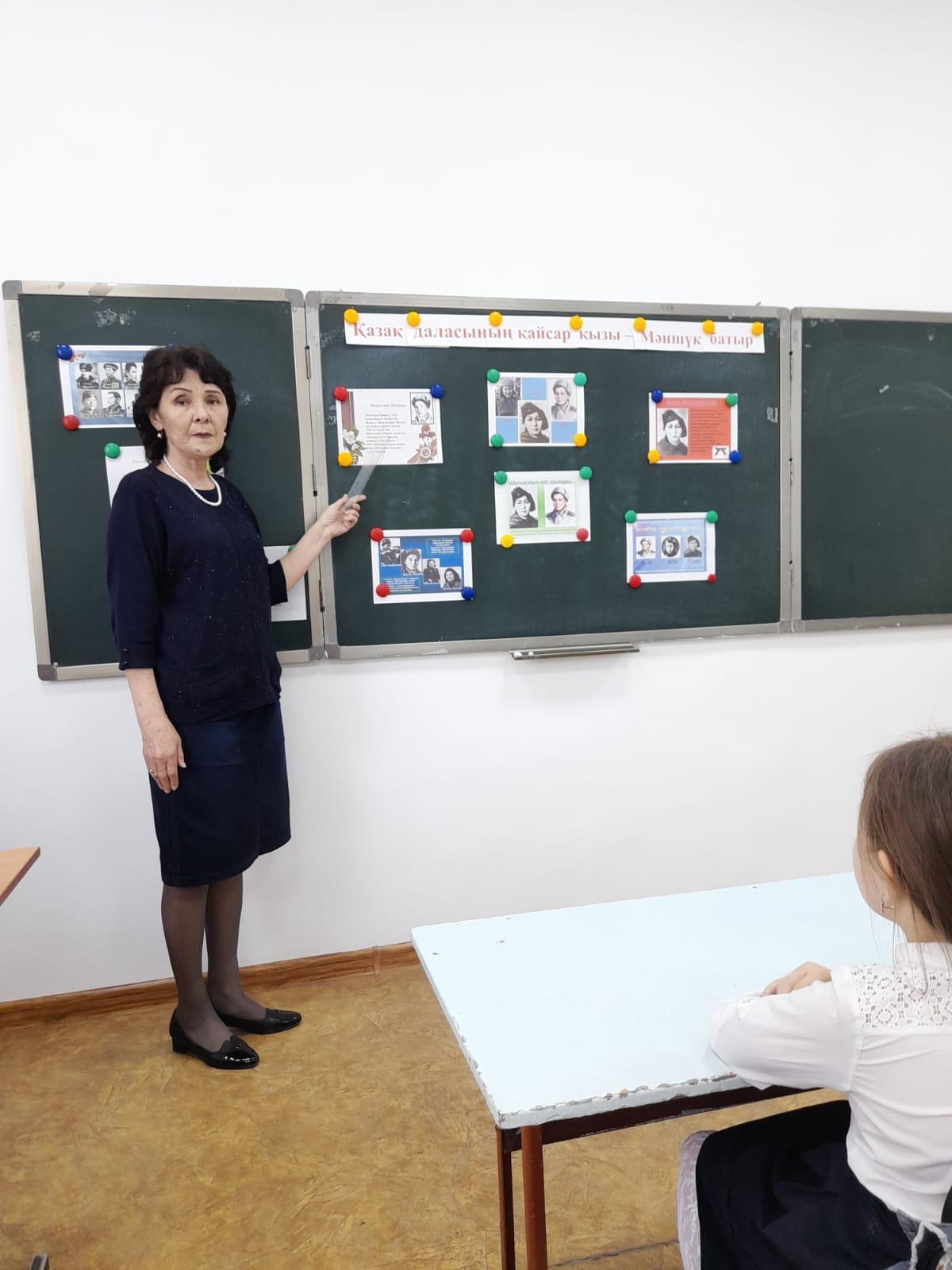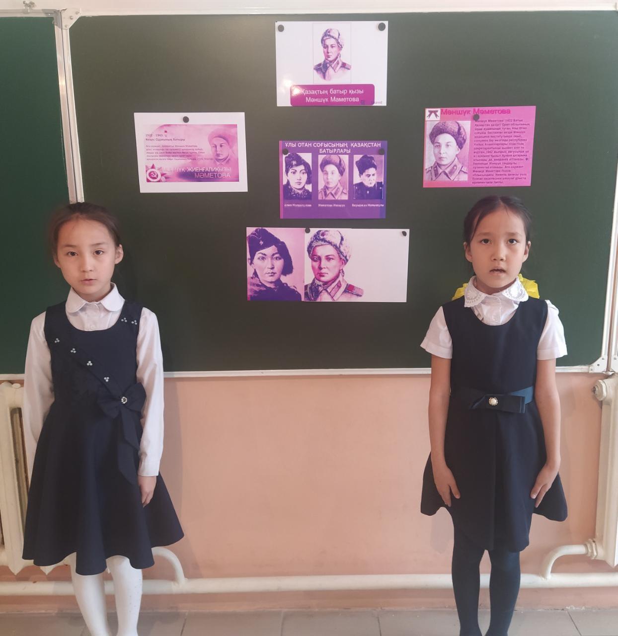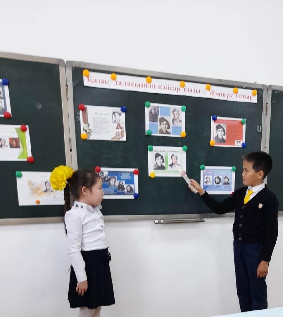 Шу қаласы «Ыбырай Алтынсарин атындағы орта мектебі»КММ-де 2022 жылы  бастауыш сынып мұғалімдерінің   ұйымдастырумен 11 сәуір күні қазақ батырлары Мәншүк Мәметова мен Хиуаз Доспанованың 100 жылдық мерейтойына  орай «Қазақ даласының қайсар қызы-Мәншүк батыр», «Ерлікті туын алаулатқан қазақ қыздары»  тақырыбында    тәрбие  сағатын өткізді. Тәрбие сағатының мақсаты: Ел қорғаған жаужүрек батырларымыз туралы ақпарат бере отырып, отанды сүюге, елін, жерін қорғауға   тәрбиелеу.  Тәрбие сағатының барысында отан үшін жан қиған тек ерлер ғана емес нәзік жанды қыздарымызда ерлікпен шайқасқандығы  туралы айтылды.
