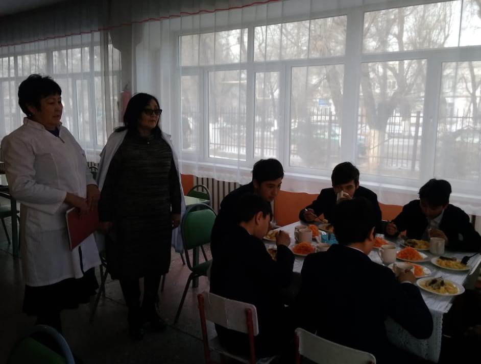 Перспективалық ас мәзіріне сәйкес ыстық тамақ күнделікті беріліп, қадағаланып отырылады. Тағамдарды дайындау технологиясы ас мәзіріне сай, беріліп отырды. Аспазшылардың формасы таза жұмыс орны да талапқа сай. Шағым және ұсыныс журналы бар. Күнделікті тамақтың сынамасы алынып отырылады. Таза сумен қамтамасыз етілген. Мектеп асханасы денсаулық бұрыштарымен безендірілген.