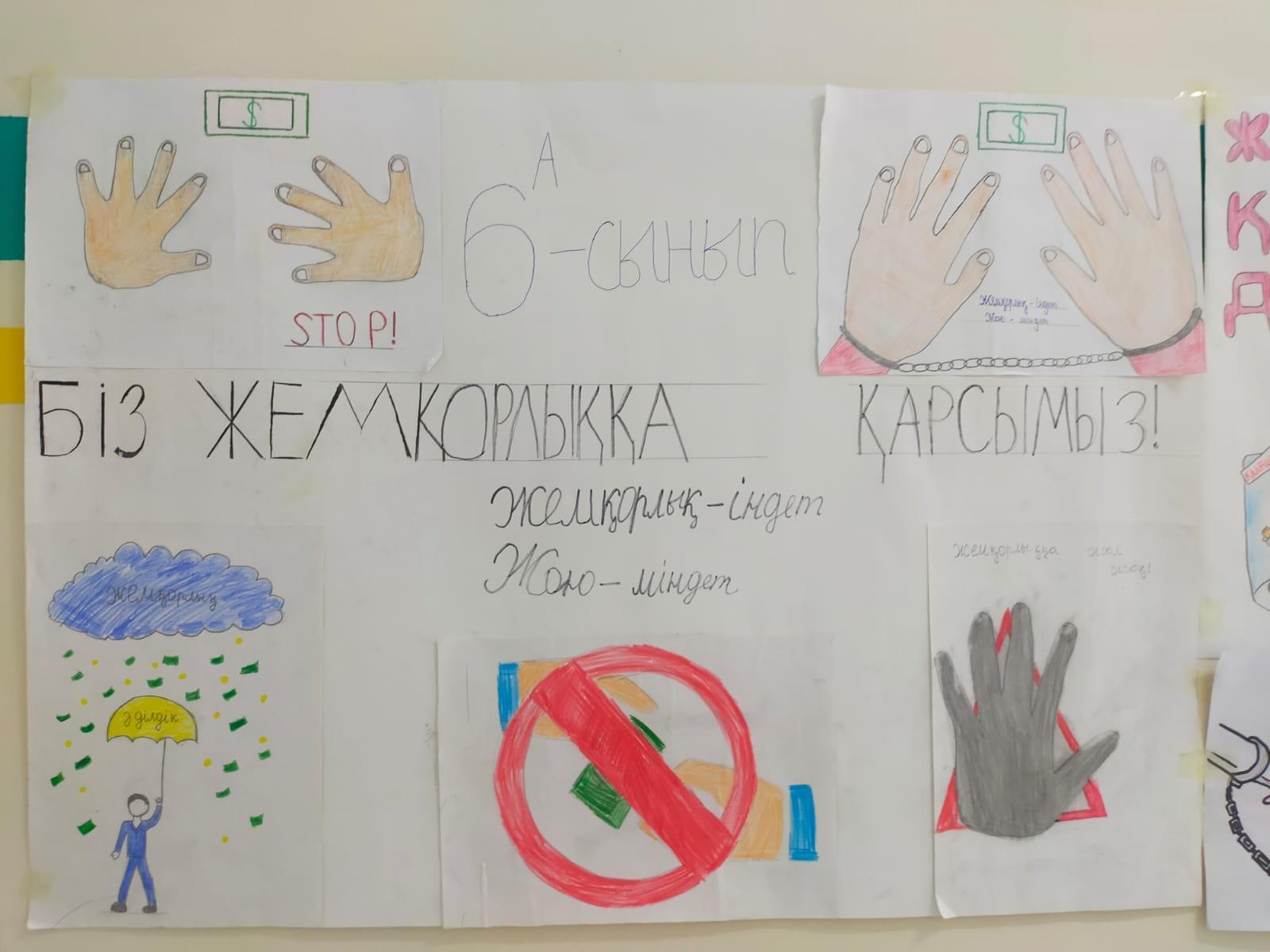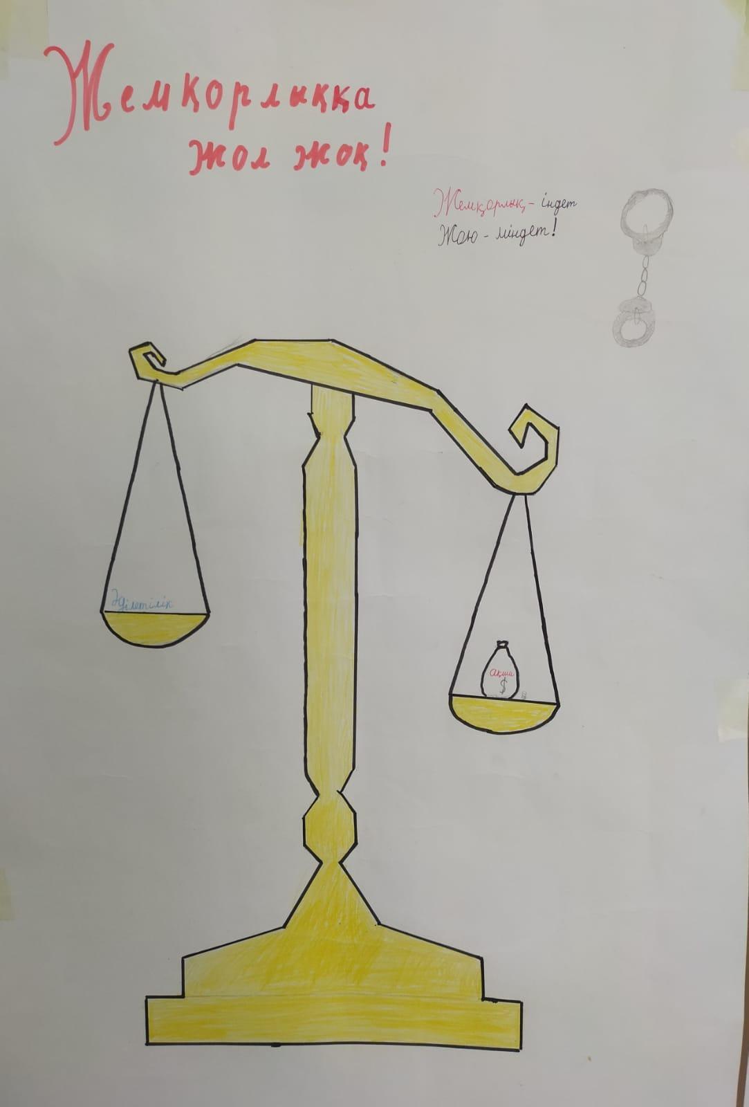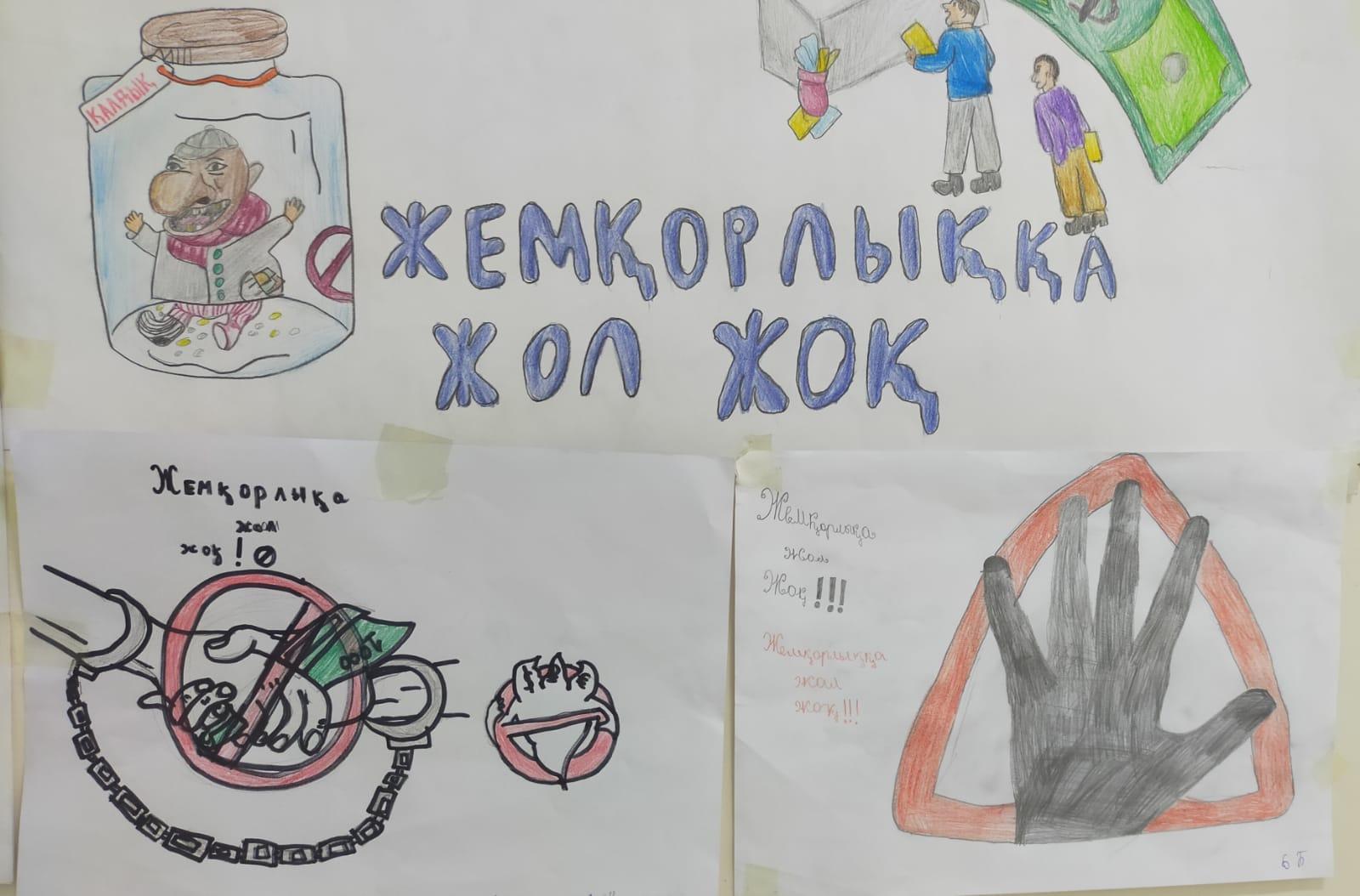 Мақсаты: Школьникам жемқорлық індет екенін, еліміздің ұлттық мүддесіне қауіп төндіретіні сурет арқылы көрсетілді. Адалдық ұғымын кеңінен насихаттау, заңдылық пен жемқорлыққа қарсы тәртіп орнату, сыбайлас жемқорлық құбылыстарына қарсы әрекет ете білуге тәрбиелеу