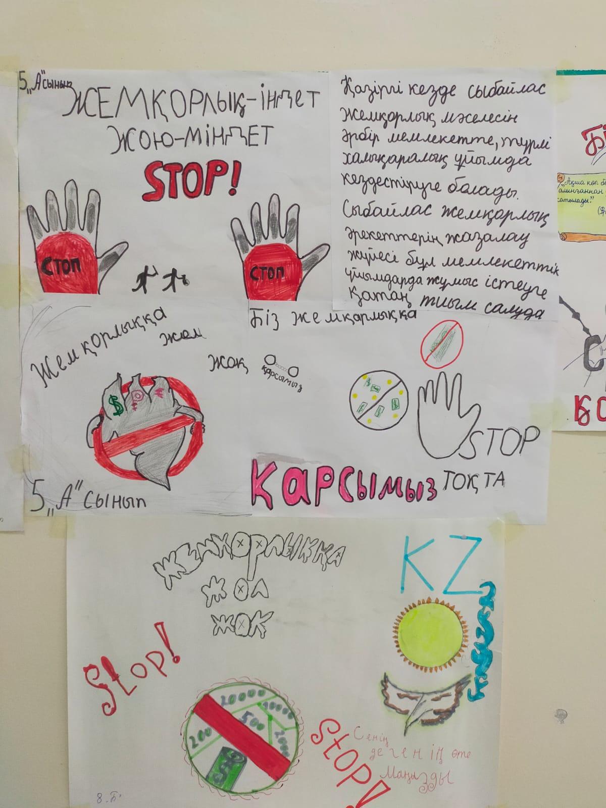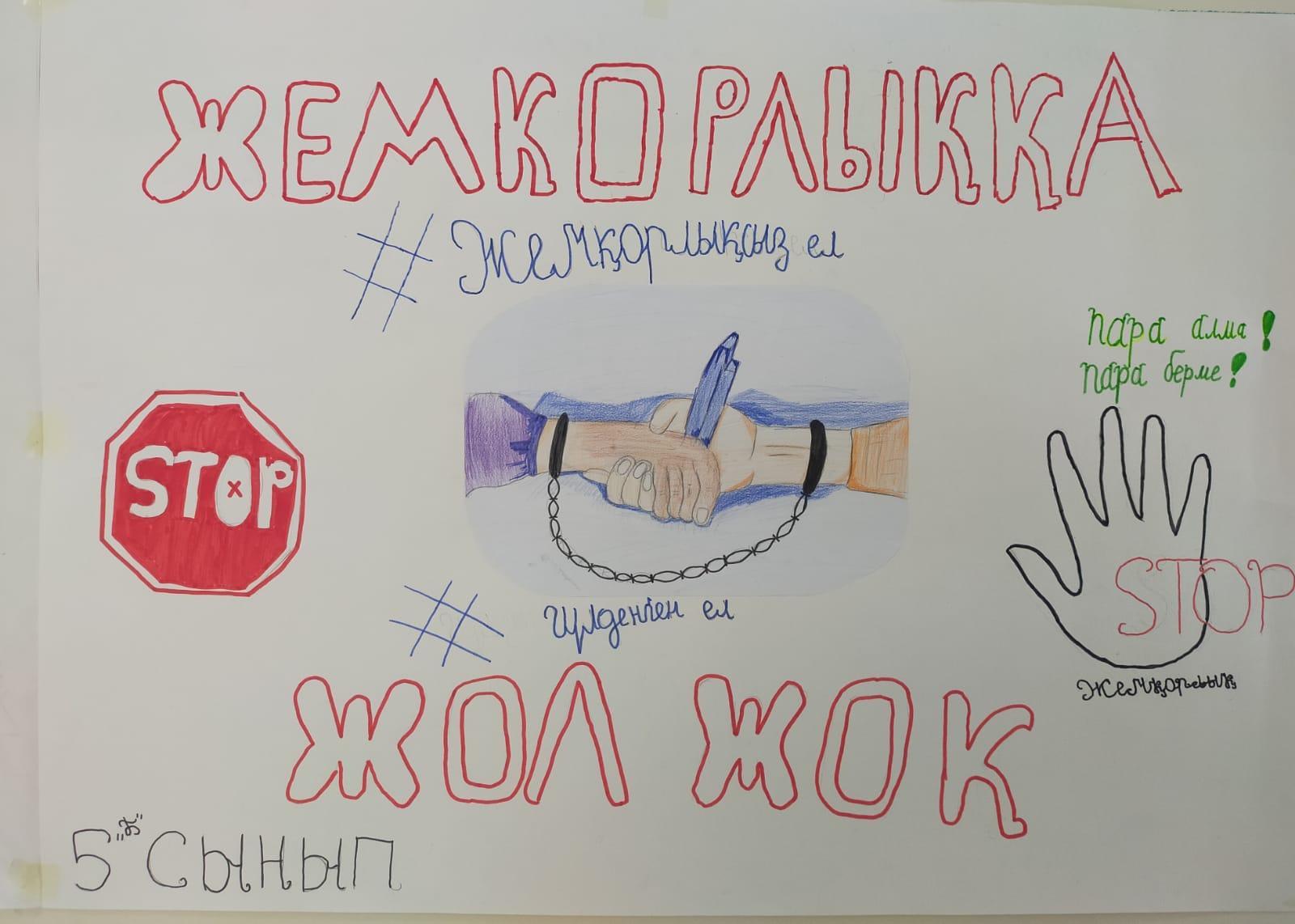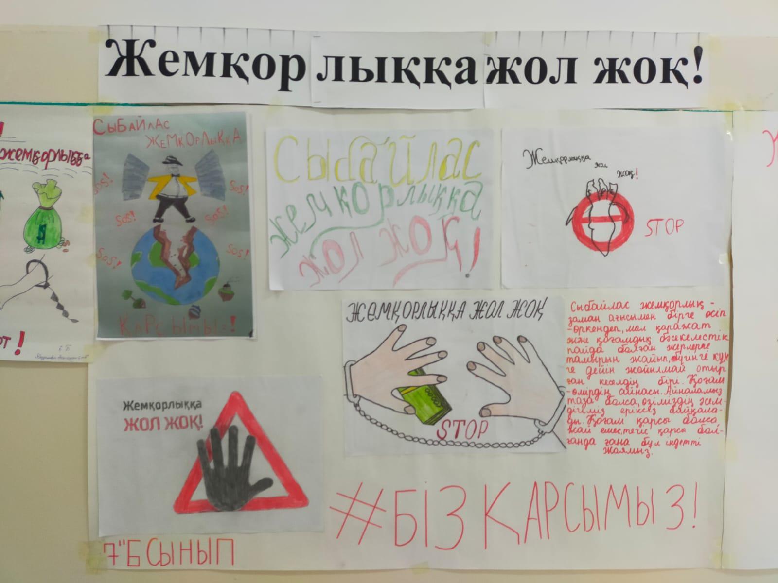 Мақсаты: Школьникам жемқорлық індет екенін, еліміздің ұлттық мүддесіне қауіп төндіретіні сурет арқылы көрсетілді. Адалдық ұғымын кеңінен насихаттау, заңдылық пен жемқорлыққа қарсы тәртіп орнату, сыбайлас жемқорлық құбылыстарына қарсы әрекет ете білуге тәрбиелеу