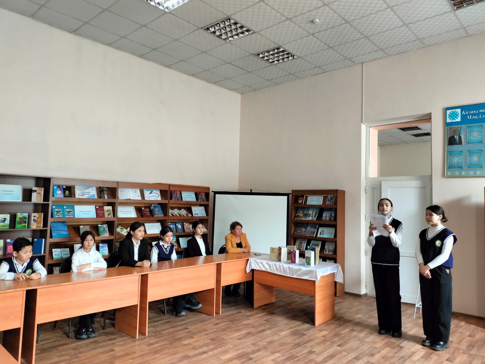 Шу қаласы «Ыбырай Алтынсарин атындағы орта мектебі» Управления образования Кызылординской области нде 2024 жылдың 15ақпан күні қазақтың ұлы ақыны Мұқағали Мақатаевтың туылған күніне орай «Мұқағали – мәңгілік ғұмыр» тақырыбында мектеп кітапханашысыДаулетова Ақзада Ноғайбекқызы