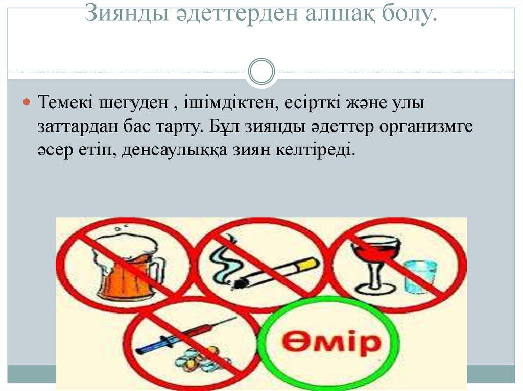 Шу қаласы Ыбырай Алтынсарин атындағы орта мектебі бойынша жасөспірімдер арасында зиянды әдеттердің алдын алу, оған жол бермеу мақсатында WhatsApp әлеуметтік желісі арқылы 8-11 сынып оқушылары мен ата-аналар чаттарына «Жасөспірімдер арасында зиянды заттардың алдын алу» тақырыбын жаднамалар мен бейне роликтер таратылды. Әрине, бұл зиянды әдеттер баланың тәрбиесіне, көп жағдайда қоршаған ортасына байланысты. Жасөспірім кезінде бала психикасы тұрақсыз болып келеді. Осыған байланысты онда еліктеушілік пайда болады. Демек, темекі шегу, ішімдік ішу, т.б. Солардың бірі – есірткіні қолдану. Қаншалықты жасөспірімдер шылым шегумен ертерек танысып, шылым шеге бастаса, соншалықты олар оған тез үйренеді және болашақта шылым шегуден бас тарту олар үшін өте қиын болады. Және де басқа нәрсені татып көруге қызығушылықтары туады. Яғни, темекіден әлде-қайда зиянды заттар. Жасөспірімдердің темекі тартуы, бірінші кезекте жүйке және жүрек-қан тамырларының жүйесіне әсер етеді.