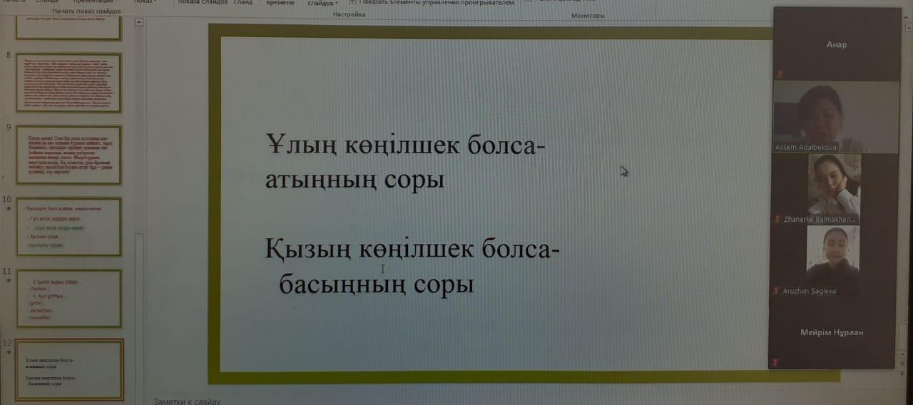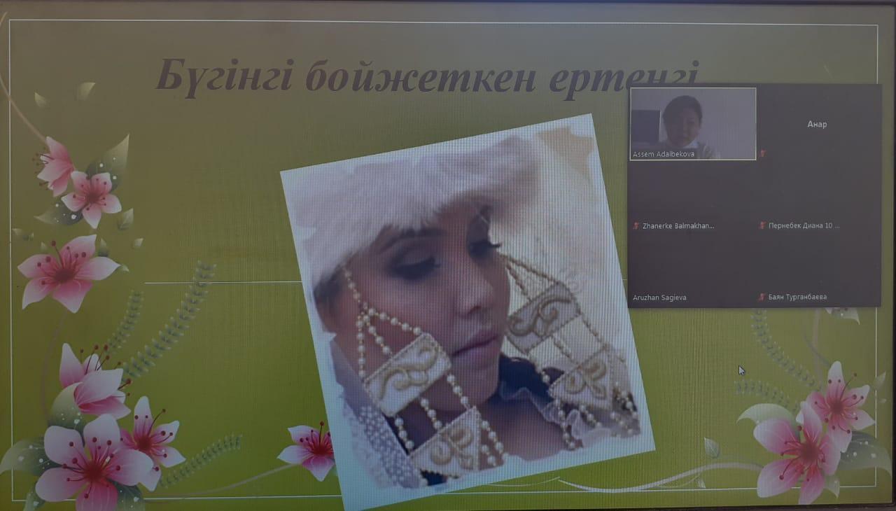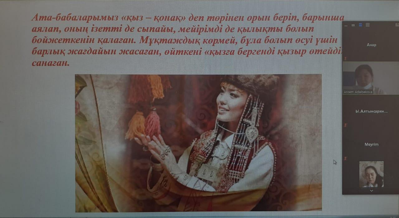 Шу қаласы «Ыбырай Алтынсарин атындағы орта мектебі » КММ –де «Қыз Жібек» қыздар клубының жоспарына сәйкес «Қыз бала ұлттың –ұяты, халықтың шырайы» атты айлық жүргізілуде.2021 жылдың 29 қаңтар күні мектеп директорының тәрбие ісі жөніндегі орынбасарыА.Р.Адалбекова "Қыз Жібек" клубының мүшелерімен 8-11 сынып қыздарымен "Бүгінгі бойжеткен, ертеңгі ....." тақырыбында баяндама оқып, ақпараттық түсіндірмелік іс-шарасын өткізді. Мақсаты: Қыздармен әңгімелесе отырып, ар-намысын, сұлулығын жоғары қоя біліп, жұрт алдында абыройлы болуға тәрбиелеу. Салауатты өмір салтын қалыптастырудағы ой өрісін дамыту зиянды әрекеттерге еліктеудің, қызығудың өмірлеріне қауіп тудыратынын ескерту. Іс-шара соңында "Қыз баланың сұлулығы иманында " , «Қыз әдебі», «Қыз қандай болу керек ? » сияқты бірнеше бейнероликтер көрсетілді.