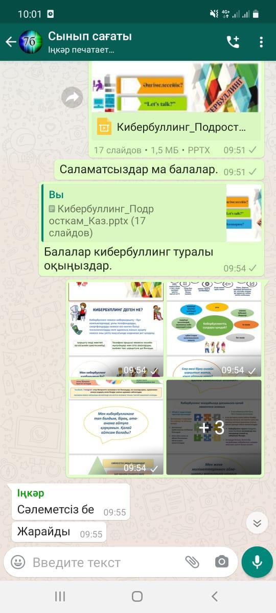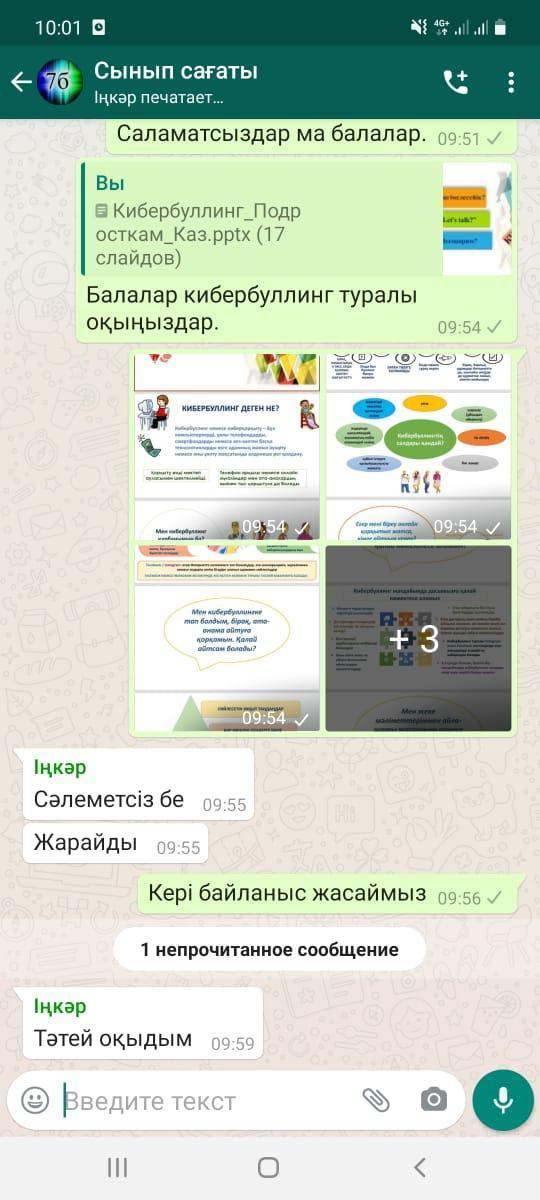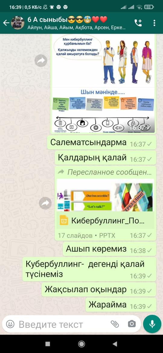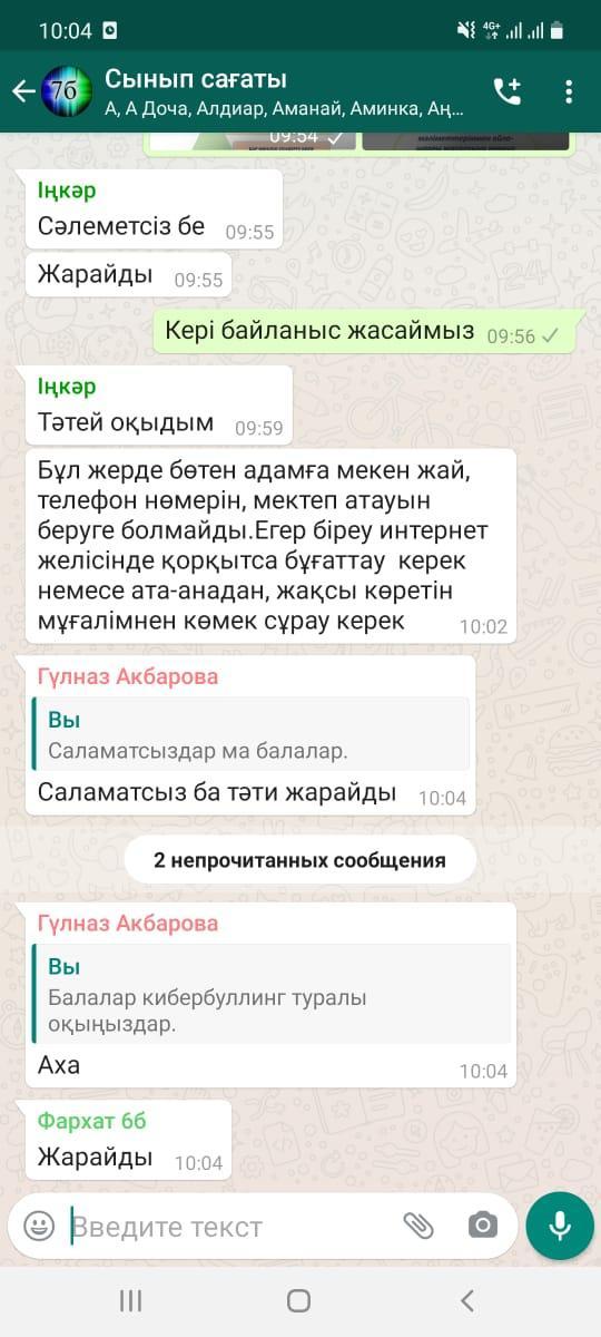 Шу қаласы «Ыбырай Алтынсарин атындағы орта мектебі»Управления образования Кызылординской области нде 2021 жылдың 25-30 қазан аралығында мектеп психологы Г.Н.Джанибекова 7-11 сынып білім алушылар арасында « Кибербуллинг» деген не? тақырыбында білім алушыларға түсіндірме жұмыстарын жүргізді. Бұл смс-хабарламалар, әлеуметті желілер, абыройды төгетін веб-парақшалар ашу немесе қорлайтын, тіл тигізетін бейнеконтент жариялау арқылы, тағыда басқа да жолдармен жасалынаты туралы сынып жетекшілермен бірлесе сынып сағаттарын,WhatsApp әлеуметтік желесі арқылы білім алушыларға жадынама таратылып, кибербуллингтан қорғану жолдары туралы кеңес беріліп,түсіндірме жұмыстарын жүргізді.Сонымен қатар Қазақстанда балалар мен жастар үшін №150 Ұлттық телефон желісі қызмет жасайды, ол балаларға қатысты қатыгездік көрсетуді жою жүйесіндегі алғашқы және маңызды буындардың бірі болып табылады. Сенім телефоны барлық телефон шалушыларға тәулік бойы анонимді психологиялық және заңды көмектер көрсететіндігі туралы ақпарат берілді.