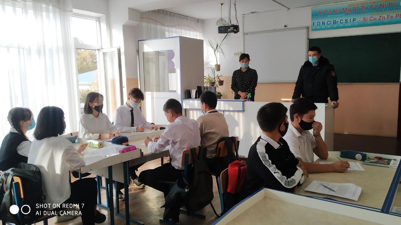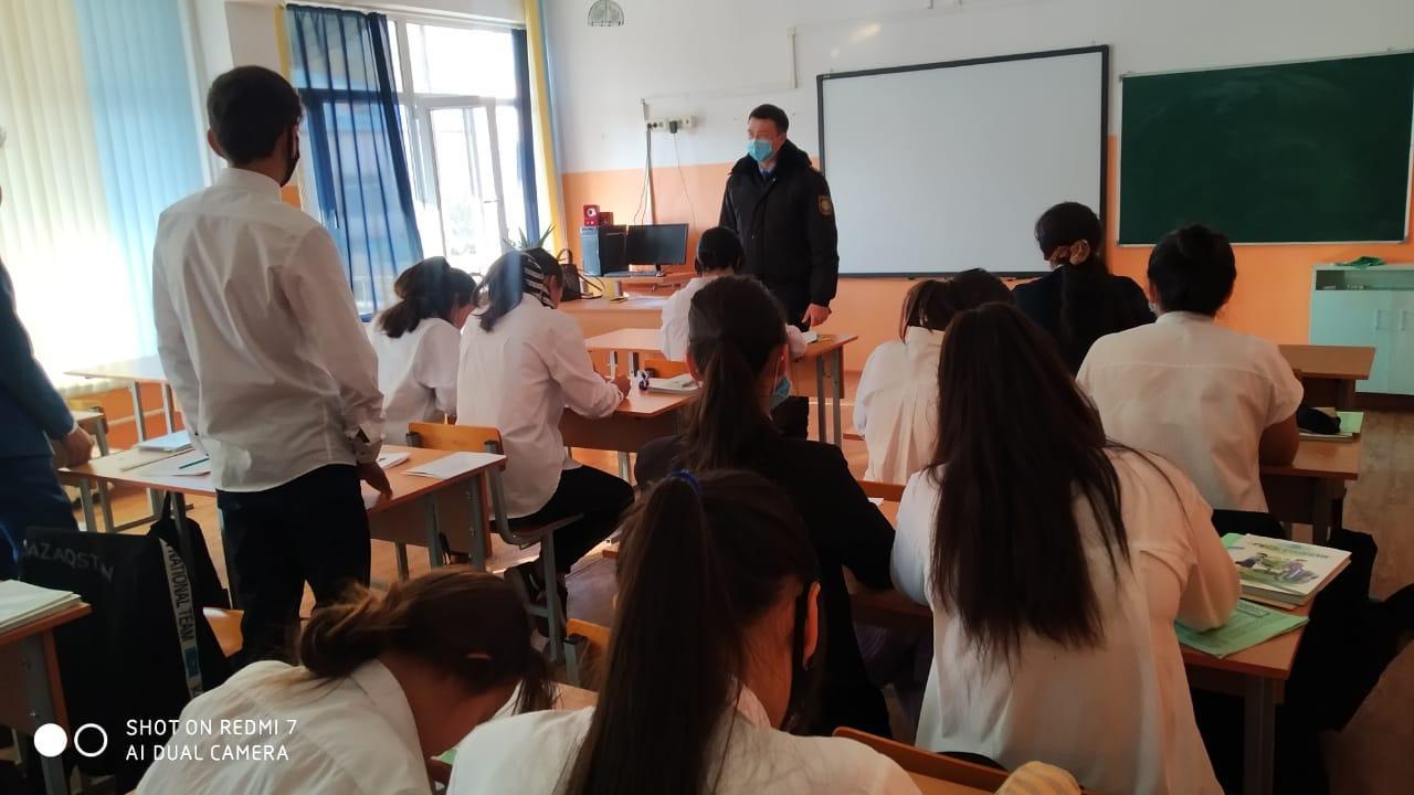 Шу қаласы Ыбырай Алтынсарин орта мектебінде 2021 жылдың 18 қараша күні  «Бала құқығы – адам құқығы» айлығы барысында  АПБ-нің ЖПҚ ЮПБ-нің учаскелік полиция инспекторы полиция капитаны Б.С.Джабасбаев білім алушылардың құқықтық сауаттылығын арттыру мақсатында  «Заңды білу –заман талабы» тақырыбында 8-10 сыныптардың білім алушыларымен кездесу өткізді. Б.С.Джабасбаев кездесу барысында білім алушыларға біз өз мемлекетіміздің азаматтары болғандықтан, оның заңдарымен өмір сүруге, оны құрметтеуге міндетті екніміз туралы айта келе, жасөспірімдер арасында кездесетін құқық бұзушылықтар туралы ,  ол үшін әкімшілік жауапкершіліктер туралы айтып, білім алушылардың құқық бұзбауға шақырды.