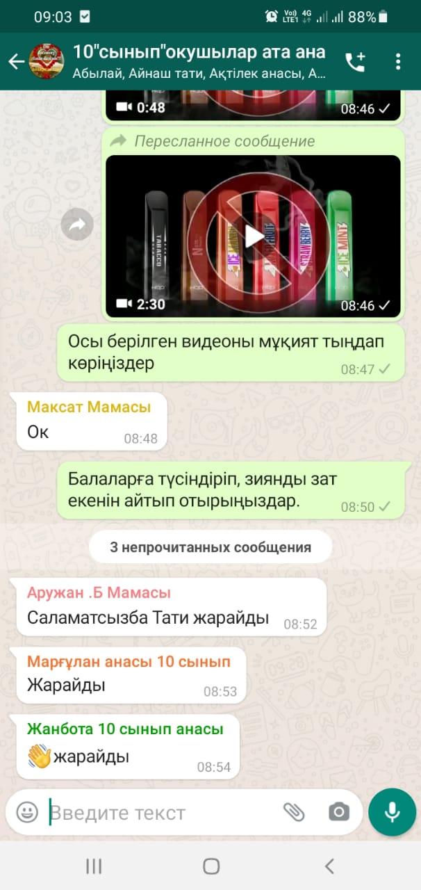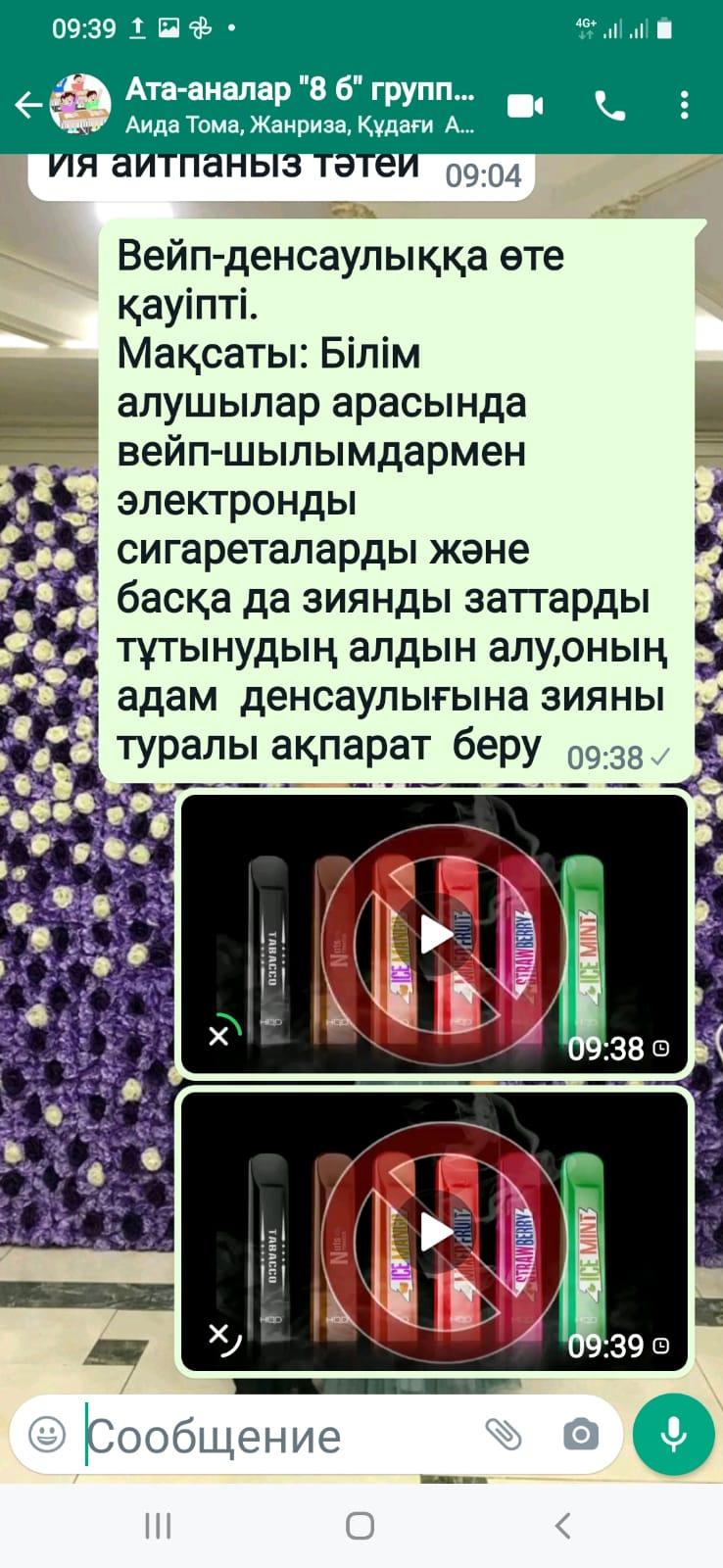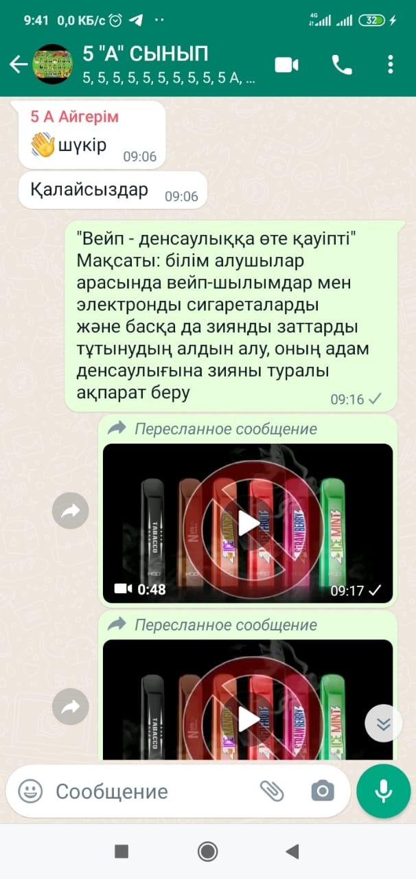 Шу қаласы«Ыбырай Алтынсарин атындағы орта мектебі» КММ-де 2021 жылдың 8 желтоқсан күні 5-11 сыныптардың ата-аналарына «Электронды сигареттер балалардың өмірі үшін өте қауіпті» , қазіргі заманғы психо белсенді заттардың проблемалары, оларды тарату ерекшеліктері, олардың заңсыз айналымына кәмелетке толмағандарды тарту бойынша ақпараттық-түсіндірме жұмыстары жүргізілді. Жиналыс барысында мектеп психологы Ж.Т.Қаратаева «Вейп – денсаулыққа өте қауіпті» тақырыбында баяндама оқып, тақырып аясында бейнебаян көрсетті. Қалған ата-аналарға Whatsapp желісі арқылы ақпараттар беріліп, бейнебаяндар жіберілді.