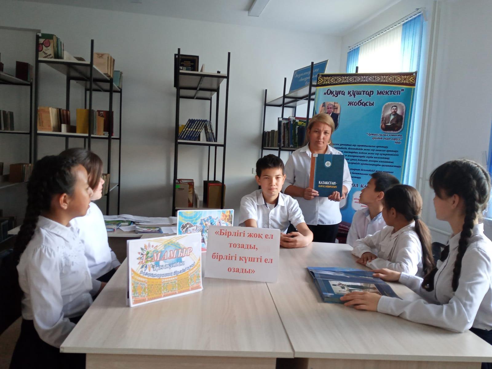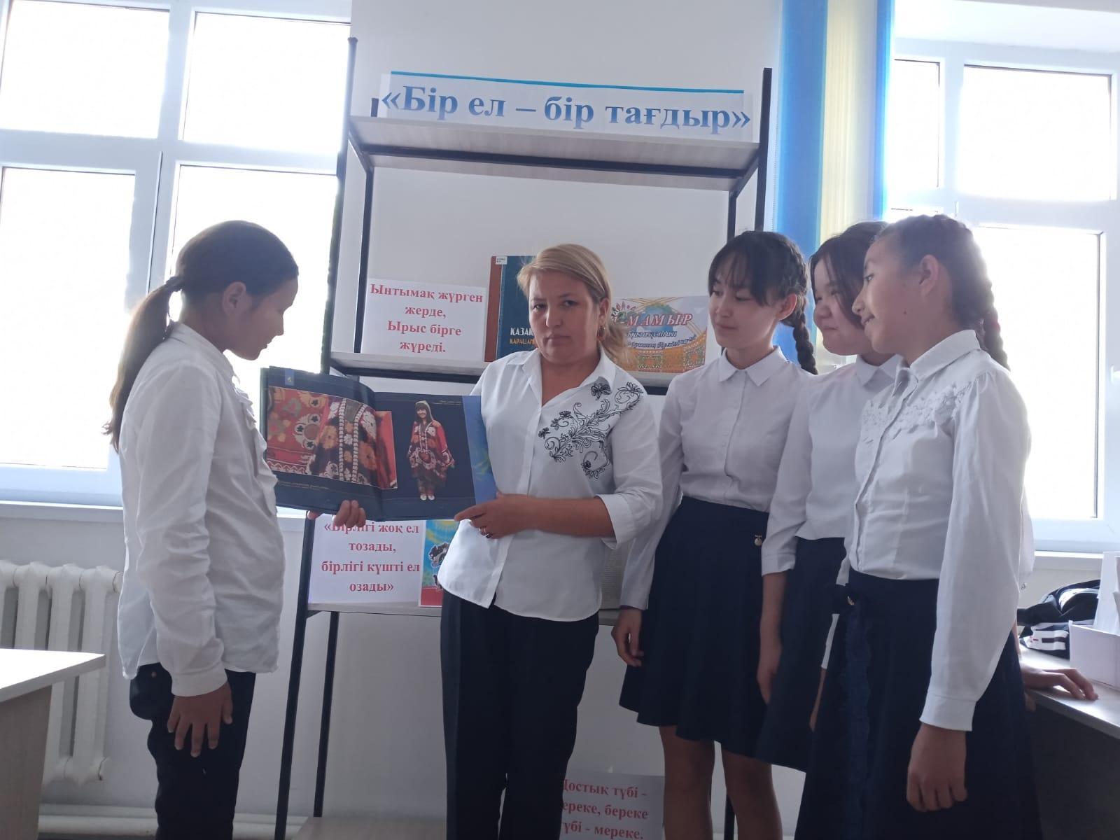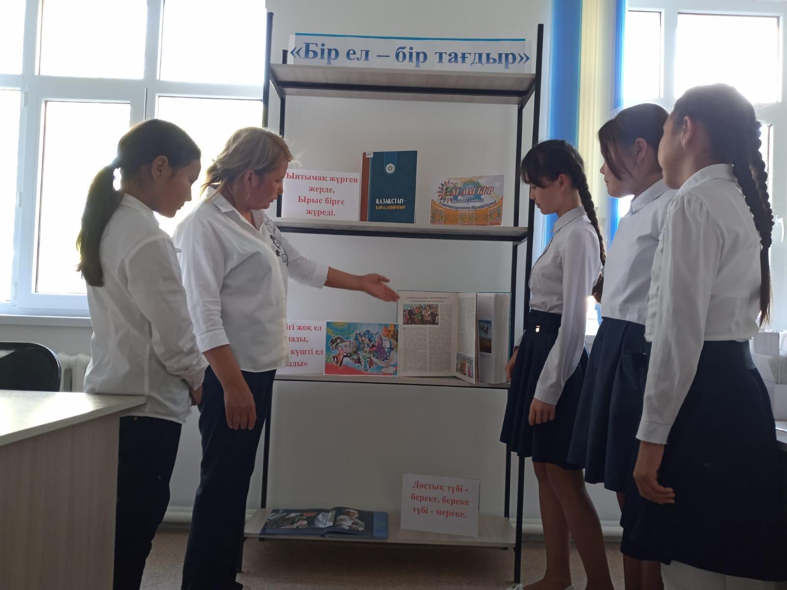 Шу қаласы «Ыбырай Алтынсарин атындағы орта мектебі »КММ-де 1-мамыр Қазақстан Халықтарының бірлігі күніне орай «Бір ел-бір тағдыр»тақырыбында мектеп кітапханашысының кітап көрмесі ұйымдастырылды. Көрмегебасылымдар, нақыл сөздер,көркем суретер койылды. Білім алушыларға, елімізде бейбіт өмір сүріп жатқан ұлт өкілдерінің татулығы туралы жан - жақты мәлімет берілді. 6 - сынып білім алушылары қамтылды.