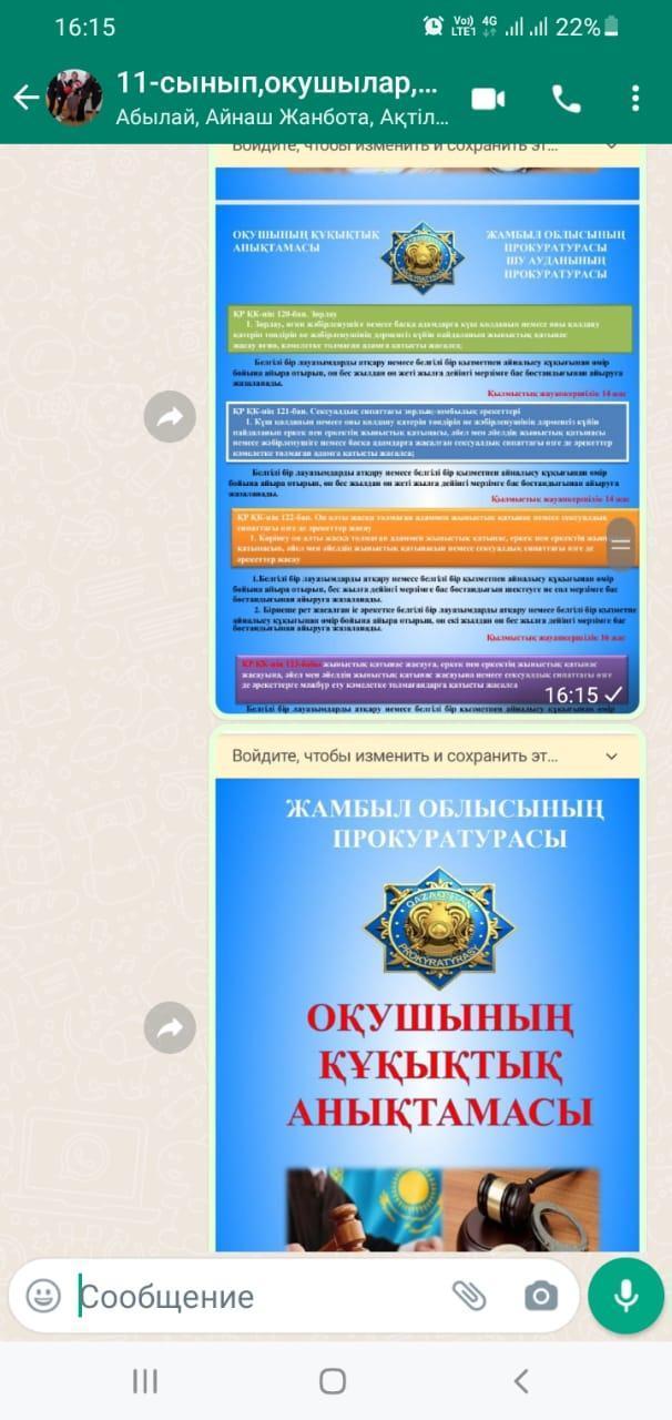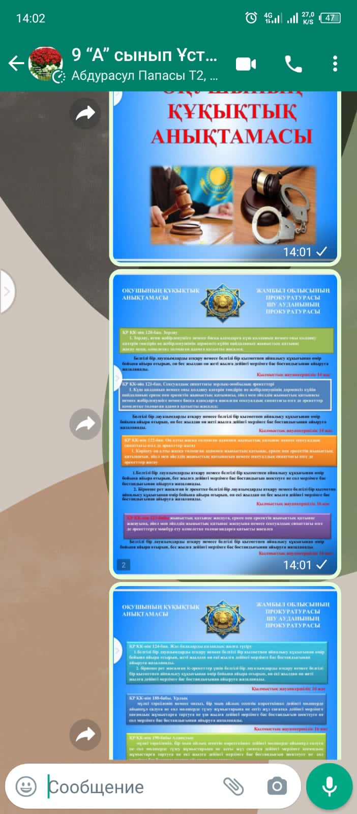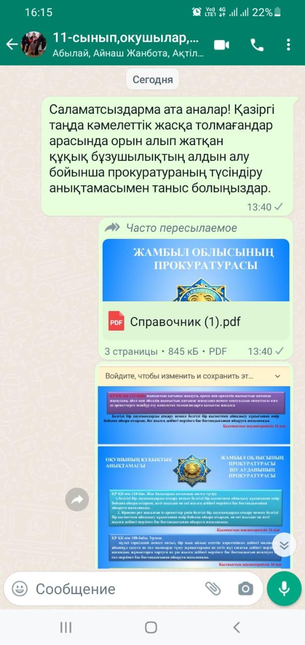 Шу қаласы Ыбырай Алтынсарин атындағы орта мектебі» КММ-де 2022 жылдың 07-қазан күні кәмелетке толмағандармен жиі орын алатын қылмыстарды болдырмау, жасөспірімдердің құқықтарын қорғау мақсатында Жамбыл облысы прокуратурасы әзірлеген ҚК-тің баптарын түсіндіру жөніндегі анықтамасы мектеп мұғалімдері мен сынып жетекшілерге, білім алушыларға жан-жақты түсіндіріліп, ата-аналар чаттарына жолданды.