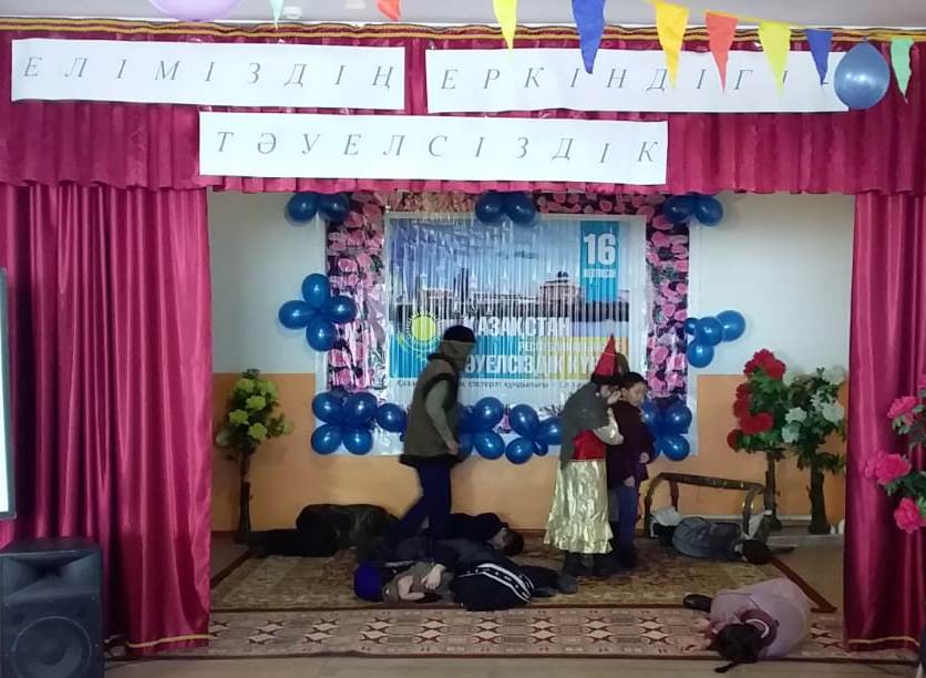 16 желтоқсан Тәуелсіздік күніне арналған 8 «А», «Б» сынып жетекшілері Л.Е. Хусайнова, Г.Н. Джанибекованың ұйымдастыруымен 14 желтоқсан күні «Еліміздің ертенгісі-Тәуелсіздік» атты салтанатты жиын өткізілді. Мерекелік шараны мектеп директоры Г.Б. Сейдахметова өзінің құттықтау сөздерімен айтты. Бүгінде салауатты өмір салтын ұстанатын еңбек құмар, өзін-өзі жетілдіруге үнемі ұмтылатын өршіл қайсар етіп тәрбиелеуді, дәстүрімізді ұлттық және жалпы адамзаттық құндылықтарымызды қастерлейтін рухани дүниесі кең тұлғаны қалыптастыруды көздейтін «Бірыңғай «Жас ұлан» балалар мен жасөспірімдер ұйымы» қатарына 2 «А», «Б» сыныптарының