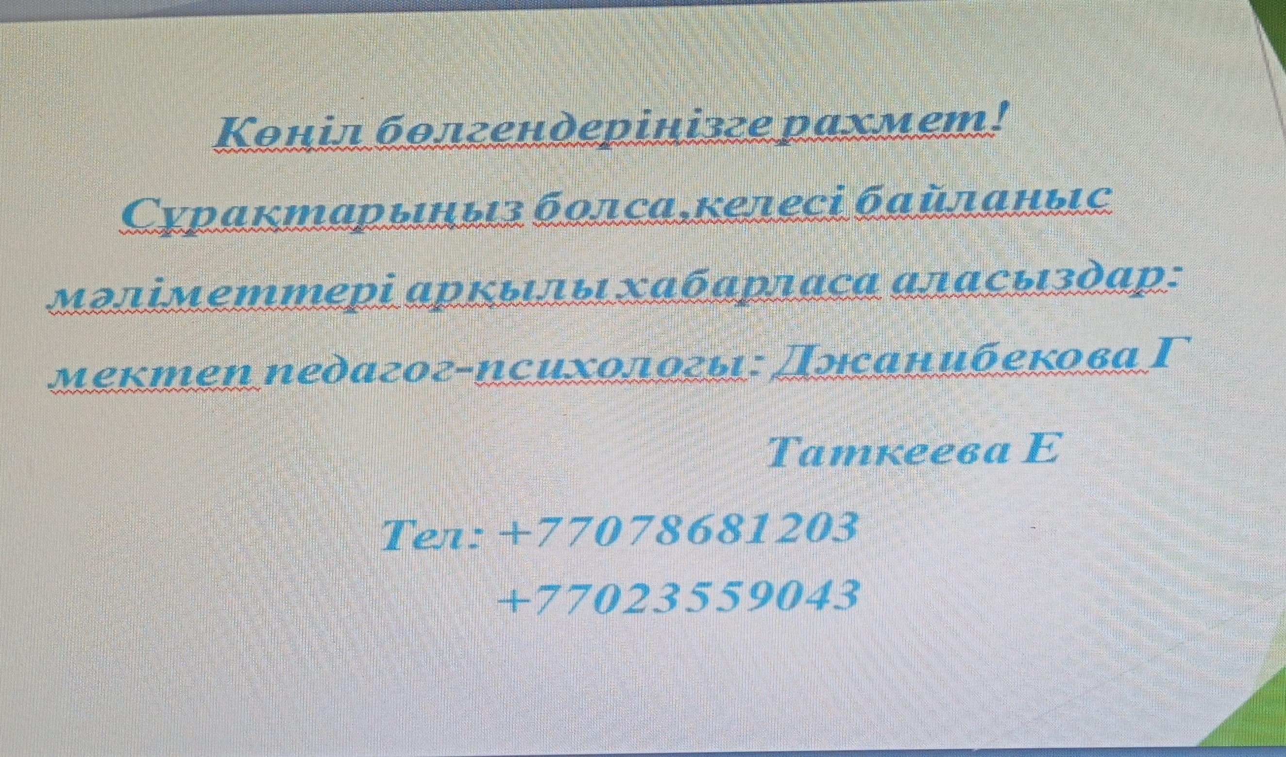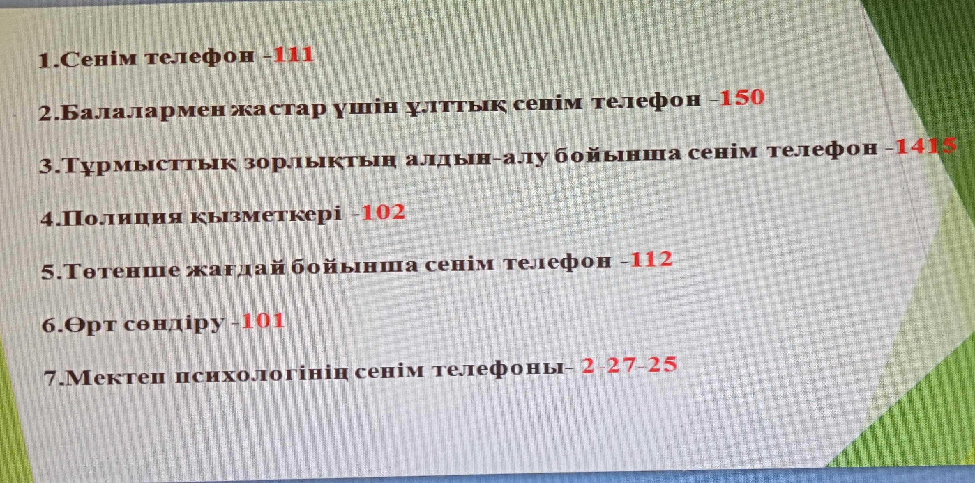2020 жылдың 21 қазан күні «Сенім телефоны» шұғыл қызмет көрсету, жәрдем беру мақсатында WhtsApp желісі арқылы 1-11 сынып оқушыларына түсіндірме жұмыстары жүргізілді.